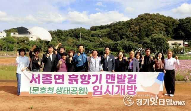 ‘서종면 흙향기 맨발길’은 하늘에서 바라보면 서종면의 ‘서’ 자를 형상화한 걷기 코스로, 문호천의 아름다운 자연경관과 어우러진 생태 친화형 산책길이다. 특히, 약 1,500평 규모에 만개한 코스모스 꽃밭은 행사 당일 주민들과 방문객들의 눈길을 사로잡으며 큰 호응을 얻었다.