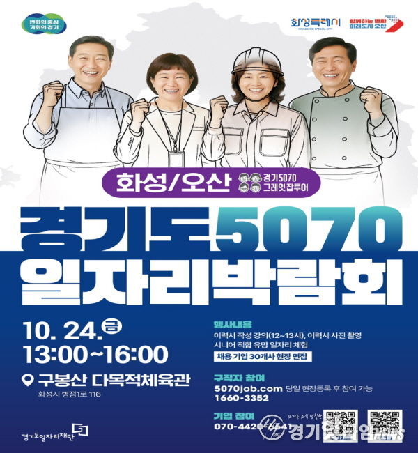[경기핫타임뉴스=김삼영 기자] 경기도와 경기도일자리재단은 오는 10월 24일, 구봉산 다목적체육관에서 중장년층을 위한 『2025 경기도 5070 일자리박람회 in 화성+오산』를 개최한다고 밝혔다.
