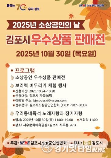 [경기핫타임뉴스=김형철 기자] 김포시소상공인연합회에서 오는 10월 30일 사우문화체육광장에서 지역 소상공인의 우수상품을 소개하는 ‘2025 김포시 소상공인 우수상품 판매전’을 개최한다.