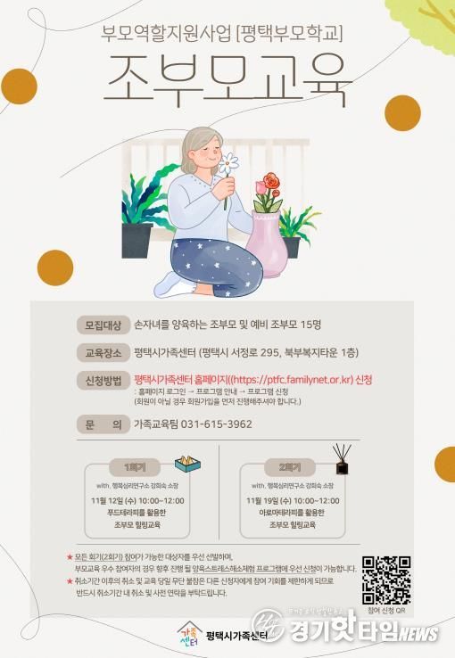 [경기핫타임뉴스=김삼영 기자] 평택시가족센터는 부모역할지원사업[평택부모학교]의 하나로 손주를 양육하는 조부모 및 예비 조부모를 대상으로 ‘조부모 교육’을 운영한다.