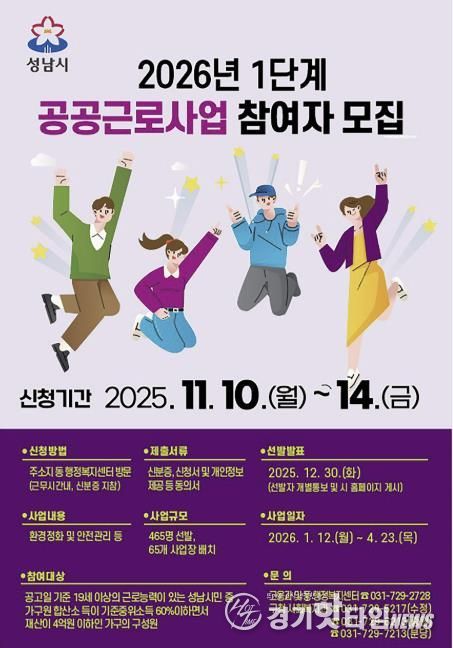 [경기핫타임뉴스=김삼영 기자] 성남시는 오는 11월 10일부터 14일까지 ‘2026년도 1단계 공공근로사업’ 참여 희망자 465명을 모집한다.