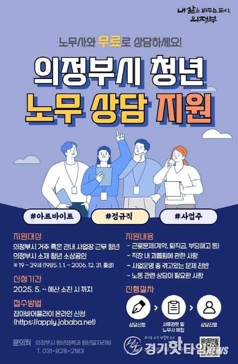 [경기핫타임뉴스=김형철 기자] 의정부시는 청년들의 근로권익 보호와 건강한 노동환경 조성을 위해 ‘찾아가는 청년 노무사 상담'을 운영한다.