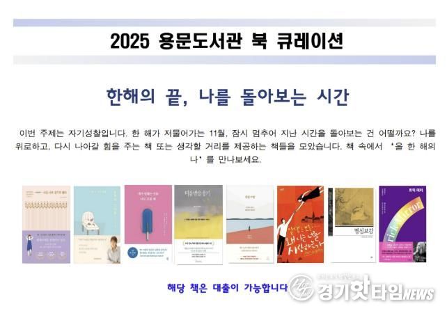 [경기핫타임뉴스=김형철 기자] 양평군은 11월 1일부터 12월 31일까지 용문도서관에서 ‘한 해의 끝, 나를 돌아보는 시간’을 주제로 한 책 추천 서비스(북 큐레이션)를 운영한다고 밝혔다.