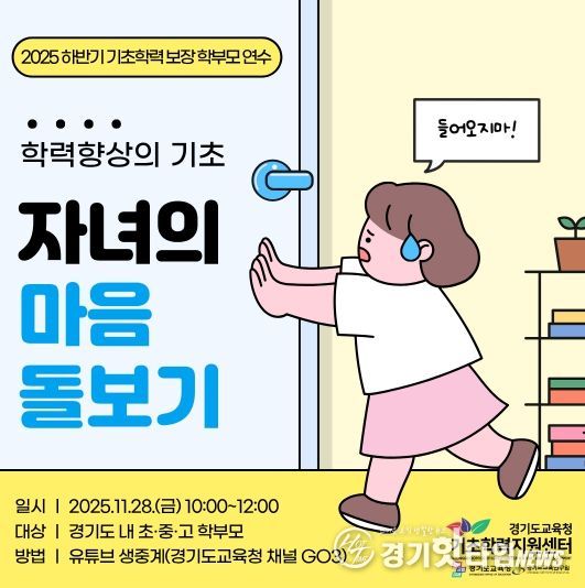 [경기핫타임뉴스=김삼영 기자] 경기도교육청 기초학력지원센터는 오는 11월 28일 오전 10시, ‘학력향상의 기초: 자녀의 마음 돌보기’를 주제로 기초학력 보장을 위한 하반기 학부모 연수를 운영한다. 마음건강 양육법에 대한 이해를 바탕으로 학부모 사회정서 지원 역량을 강화하며, 자녀의 마음건강 증진을 통해 기초학력 향상 기반을 조성하기 위한 목적이다.