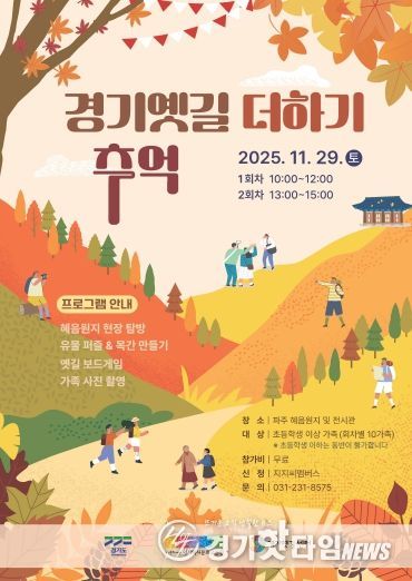 [경기핫타임뉴스=김삼영 기자] 경기문화재단 경기역사문화유산원는 오는 11월 29일 토요일, 의주길에 위치한 파주 혜음원지 일대에서 초등학생 이상 자녀를 둔 가족을 대상으로 하는 역사 체험 프로그램 ‘경기옛길 더하기 추억’을 개최한다고 밝혔다.