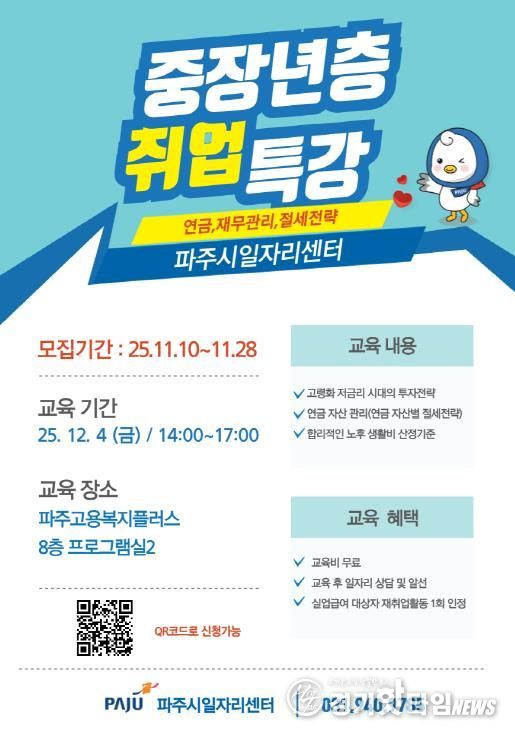 [경기핫타임뉴스=김형철 기자] 파주시는 오는 11월 10일부터 28일까지 ‘중장년층 취업 특강’에 참여할 교육생 15명을 선착순으로 모집한다.