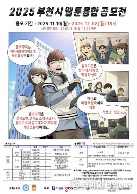 [경기핫타임뉴스=김형철 기자] 부천시는 11월 10일부터 12월 8일까지 서울신학대학교 ‘이룸(eRoom)’ 플랫폼을 통해 지역 웹툰 창작 생태계를 조성하고 차세대 창의인재를 발굴하기 위한 ‘2025 부천시 웹툰융합공모전’을 개최한다.