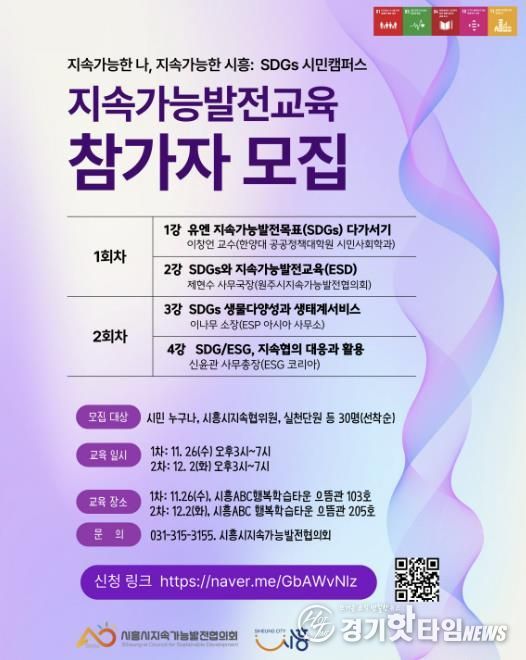 [경기핫타임뉴스=김삼영 기자] 시흥시지속가능발전협의회는 오는 11월 26일과 12월 2일 시흥ABC행복학습타운에서 양일간 ‘지속가능한 나, 지속가능한 시흥 SDGs 시민캠퍼스’를 개최한다.