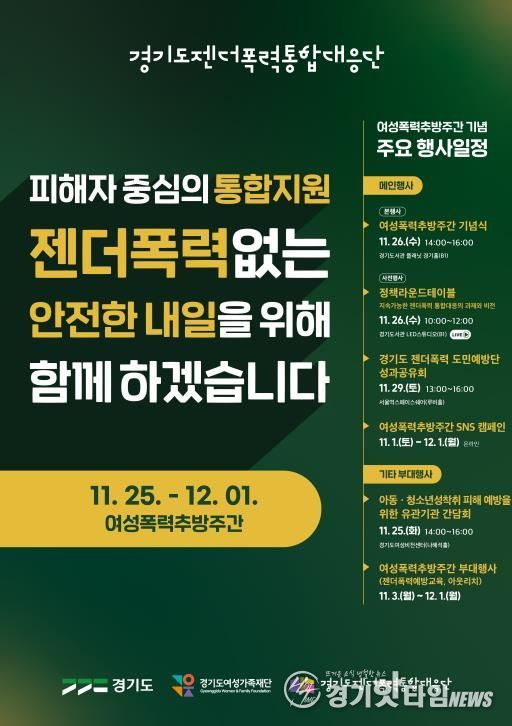 [경기핫타임뉴스=김삼영 기자] 경기도와 경기도여성가족재단 젠더폭력통합대응단은 여성폭력추방주간(11월 25일~12월 1일)을 맞아 도민과 함께하는 다양한 행사를 추진한다고 13일 밝혔다.