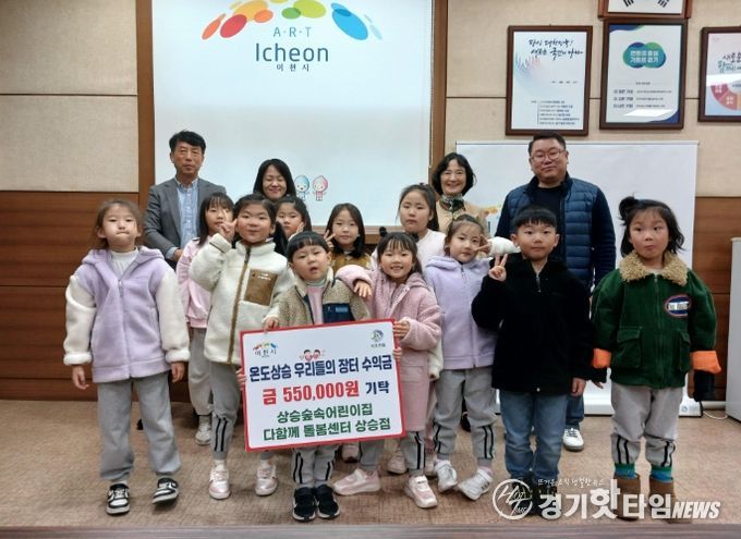 [경기핫타임뉴스=김형철 기자] 이천시 장호원읍은 상승숲속어린이집과 다함께 돌봄센터 상승점이 11월 12일, 장호원읍행정복지센터에 어린이들과 함께 방문하여 ‘온도상승 우리들의 장터’ 수익금 55만 원을 전달했다고 밝혔다.
