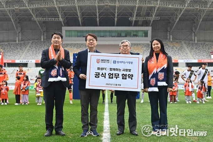 [경기핫타임뉴스=김삼영 기자] 화성FC가 취약계층 아동·청소년의 정서 지원과 문화 격차 해소를 위해 ‘함께하는 사랑밭’과 업무 협약(MOU)를 체결했다. 협약식은 지난 11월 8일(토) 화성종합경기타운 주경기장에서 열린 경남FC와의 시즌 홈 마지막 경기에 앞서 진행됐다.