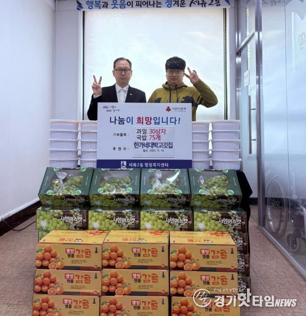 [경기핫타임뉴스=김삼영 기자] 수원시 권선구 세류2동에 위치한 '한가네 대박고깃집'은 지난 13일, 국밥 75개와 귤 10상자, 샤인머스캣 20상자를 세류2동 행정복지센터에 기부했다.