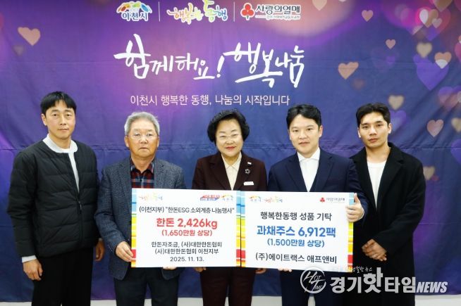[경기핫타임뉴스=김형철 기자] 이천시는 11월 13일 시청에서 지역 사회를 위한 따뜻한 나눔이 이어졌다고 밝혔다. 이날 기탁식에는 (사)대한한돈협회 이천지부와 ㈜에이트랙스 애프앤비가 참여해 이웃사랑 실천에 동참했다.