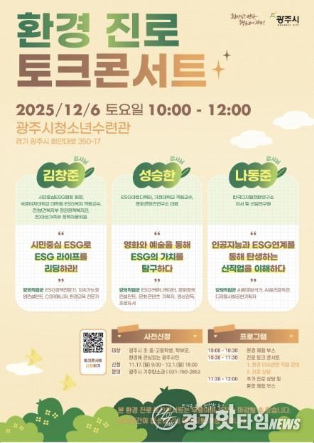 [경기핫타임뉴스=김삼영 기자] 광주시는 오는 12월 6일 청소년수련관에서 환경 분야 전문 직업인을 초청해 특강과 진로상담을 진행하는 ‘환경 진로 토크콘서트’를 개최한다고 14일 밝혔다.