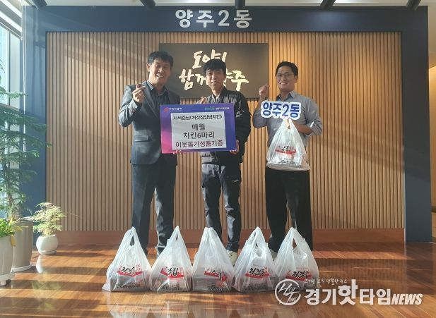 [경기핫타임뉴스=김형철 기자] 양주2동(동장 백기철)이 처갓집양념치킨 경기북부·체인본부 서석준 차장으로부터 관내 어려운 이웃에게 전달될 치킨 6마리를 매월 기부받는다.