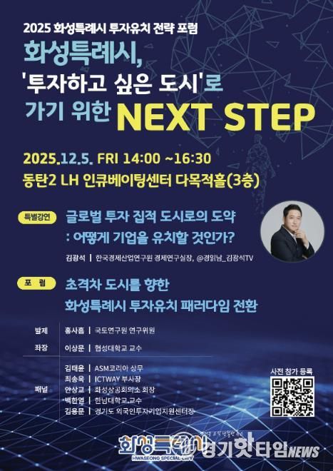 [경기핫타임뉴스=김삼영 기자] 화성특례시가 ‘2025 화성특례시 투자유치 전략 포럼’을 다음 달 5일 동탄2 인큐베이팅센터 다목적홀에서 개최한다.