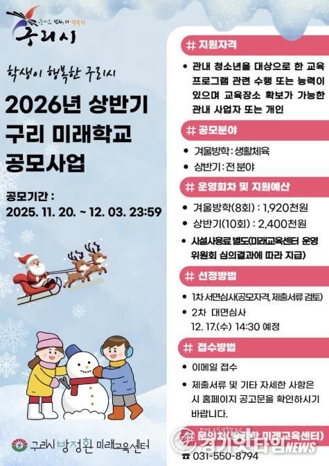 [경기핫타임뉴스=김형철 기자] 구리시는 11월 20일부터 12월 3일까지 2026년 구리 미래 교육 협력 지구 사업의 일환으로 ‘2026년 상반기 구리 미래 학교’ 공모사업을 접수한다고 밝혔다.