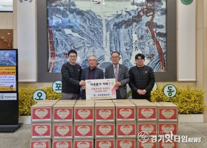 [경기핫타임뉴스=김삼영 기자] 주와함께교회는 20일 지역 내 어려운 이웃을 돕기 위해 식품 꾸러미 40박스(200만 원 상당)를 광주시 오포1동에 기탁했다.