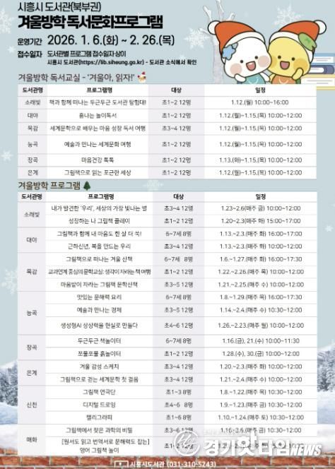 [경기핫타임뉴스=김삼영 기자] 시흥시는 겨울방학을 맞아 북부권 8개 공공도서관(소래빛ㆍ대야ㆍ목감ㆍ능곡ㆍ장곡ㆍ은계ㆍ신천ㆍ매화)에서 1월 6일부터 2월 26일까지 겨울독서교실 및 겨울방학 프로그램을 운영한다.