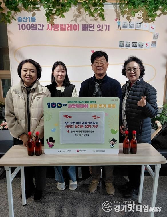 [경기핫타임뉴스=김형철 기자] 의정부시 송산1동주민센터는 11월 19일 송산1동 바르게살기위원회가 직접 만든 들기름 20병을 기부하며 ‘100일간 사랑릴레이 배턴 잇기’에 동참했다고 밝혔다.