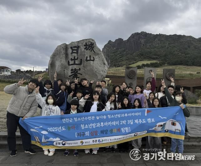 [경기핫타임뉴스=김형철 기자] (재)연천군청소년육성재단(청소년수련관 늘다솜 청소년방과후아카데미)은 지난 11월 19일부터 21일까지 제주도 일원에서 2박 3일간 ‘지구의 심장, 해양 생태계 탐험 캠프’를 안전하게 마쳤다고 밝혔다. 이번 캠프에는 늘다솜 청소년방과후아카데미 소속 청소년 23명과 지도자 3명 등 총 26명이 참여했다.