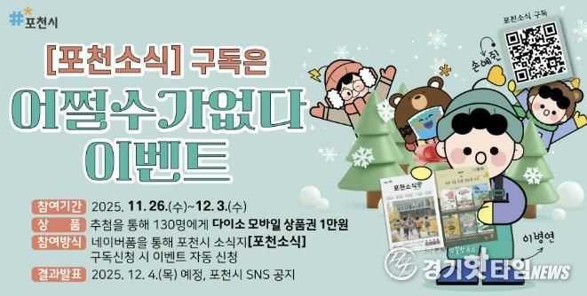 이번 이벤트는 12월 3일까지 진행되며, 시정 소식지 ‘포천소식’을 구독하면 별도의 절차 없이 자동으로 이벤트에 응모된다.