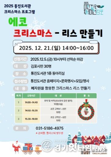 [경기핫타임뉴스=김형철 기자] 김포시 통진도서관은 다가오는 연말을 맞아 ‘에코 크리스마스-리스 만들기’를 오는 12월 21일 오후 2시부터 운영한다.