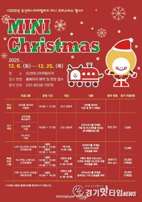 [경기핫타임뉴스=김삼영 기자] 오산시는 12월을 맞아 ‘미니 크리스마스’ 행사를 오는 12월 6일부터 25일까지 17일간 오산미니어처빌리지에서 개최한다고 밝혔다. 행사는 오전 10시부터 오후 6시까지 진행되며, 크리스마스를 주제로 전 연령이 함께 즐길 수 있는 전시와 체험 프로그램 등 풍성한 콘텐츠가 마련된다.