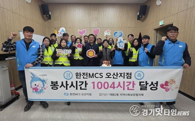 [경기핫타임뉴스=김삼영 기자] 오산시 대원2동 지역사회보장협의체는 지난 4일 한전MCS 오산지점과 함께 봉사 누적 1004시간 달성 기념행사를 개최하고, 그동안 지역 곳곳에서 꾸준히 나눔을 실천해 온 직원들의 노고를 격려하는 뜻깊은 시간을 가졌다. 이번 성과는 단기간의 활동이 아닌 지속적인 민·관 협력과 꾸준한 연계로 이뤄낸 결실로, 지역사회에서도 큰 의미를 지닌다.