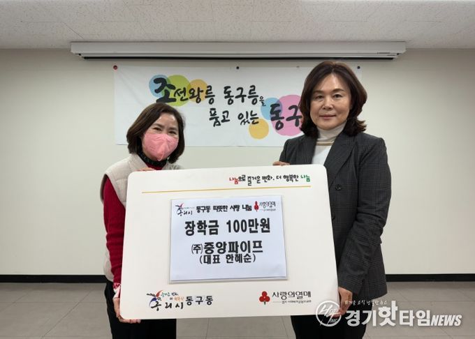 [경기핫타임뉴스=김형철 기자] 구리시 동구동은 지난 5일 동구동 행정복지센터 대회의실에서 ㈜중앙파이프로부터 취약계층 학생을 위한 장학금 100만 원을 전달받았다고 밝혔다.