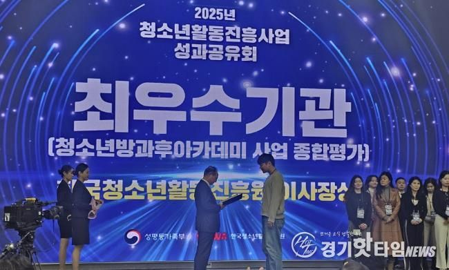 [경기핫타임뉴스=김형철 기자] (재)연천군청소년육성재단(청소년수련관) 늘다솜 청소년방과후아카데미는 지난 11월 28일 성평등가족부와 한국청소년활동진흥원이 주최하는 2025년 청소년활동진흥사업 통합 성과공유회에서 최우수 기관 선정 및 한국청소년활동진흥원 이사장상을 수상했다.