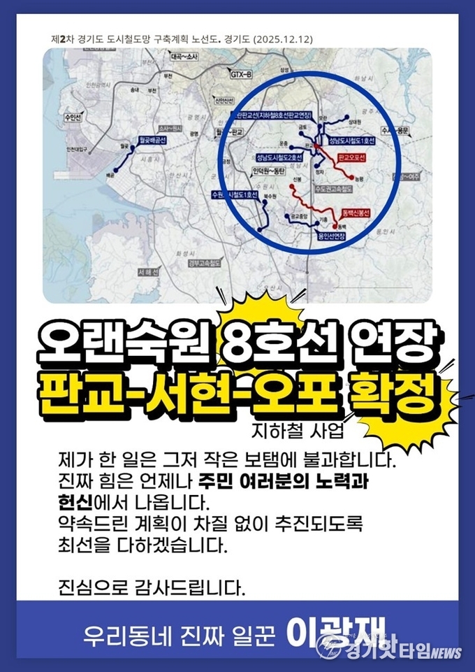 [경기핫타임뉴스=김삼영 기자] 이광재 더불어민주당 분당갑 지역위원장이 12일 경기도 제2차 도시철도망 구축계획에 8호선 판교-서현-오포 연장 사업이 최종 확정 고시된 것과 관련 "주민들과 약속해 온 교통 공약이 실질적 성과로 이어져, 이는 분당 교통 개선에 중요한 전환점이 될 전망"이라는 입장을 전했다.
