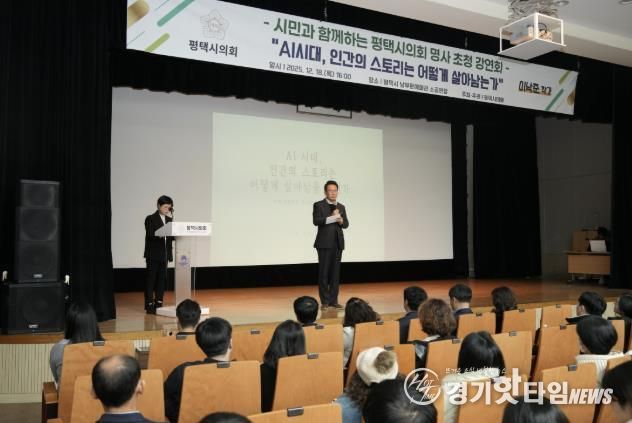 [경기핫타임뉴스=김삼영 기자] 평택시의회는 12월 18일, 평택시 남부문화예술회관 소공연장에서 명사를 초청해‘AI시대, 인간의 스토리는 어떻게 살아남는가’를 주제로 강연회를 열었다.