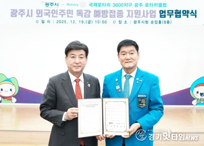 [경기핫타임뉴스=김삼영 기자] 광주시와 국제로타리 3600지구 광주 로타리클럽은 19일 외국인 주민의 건강 보호와 독감 예방을 위한 ‘외국인 주민 독감 예방접종 지원사업’ 추진에 관한 업무협약(MOU)을 체결했다.