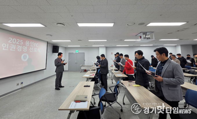 [경기핫타임뉴스=김삼영 기자] (재)용인시시민프로축구단(용인FC)은 12월 10일 구단 임직원이 참석한 가운데 인권경영 선포식을 열고, 인권을 존중하는 책임 있는 구단 운영을 실천하겠다는 의지를 대내외에 공식 선언했다.
