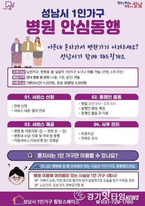 [경기핫타임뉴스=김삼영 기자] 성남시는 ‘1인 가구 병원 안심 동행 서비스’ 추진을 위해 전문 인력을 기존 4명에서 5명으로 늘렸다고 22일 밝혔다.