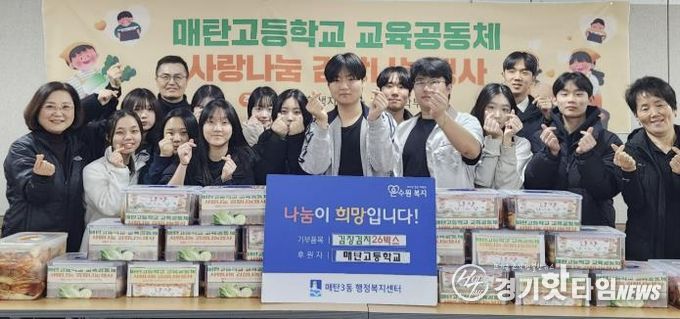 [경기핫타임뉴스=김삼영 기자] 매탄고등학교는 지난 19일, 교사·학생·학부모가 함께 참여해 마련한 김장김치 26박스를 매탄3동행정복지센터에 전달하며 지역사회에 따뜻한 나눔을 실천했다.