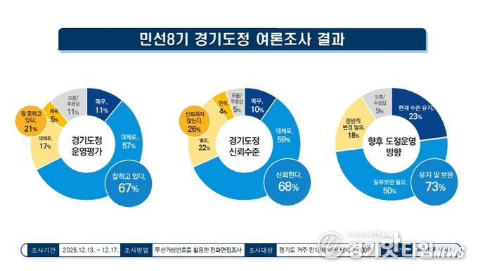 경기도가 여론조사 전문기관 넥스트리서치에 의뢰해 12월 실시한 여론조사 결과, 경기도정 운영을 ‘잘하고 있다’는 응답은 67%로 집계됐다. 이는 동일한 조사 설계로 실시한 9월 61%보다 6%p 상승한 수치다. 반면, 도정 운영을 ‘잘 못하고 있다’는 응답은 21%로 9월 22% 대비 1%p 하락했다.