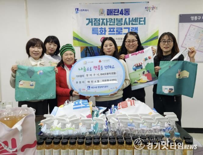 [경기핫타임뉴스=김삼영 기자] 수원시 매탄4동 자원봉사캠프 코치와 봉사회원들은 지난 12월 19일, 지역 상권 활성화와 마을 공동체 활성화를 위해 회원들이 직접 만든 장바구니와 EM(유용 미생물)을 매탄4동 행정복지센터에 전달했다.