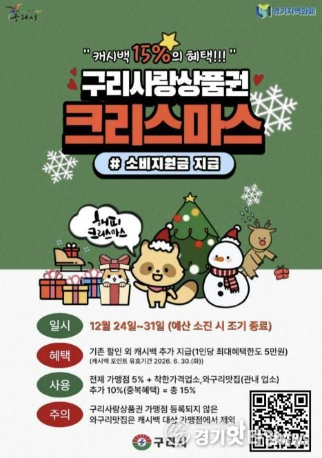 [경기핫타임뉴스=김형철 기자] 구리시는 12월 24일부터 ‘구리사랑상품권 크리스마스 소비 지원금’을 지급한다고 밝혔다. 이번 소비 지원금은 연말연시 기간 지역 외로 유출되는 소비를 지역 내로 유도하고, 관내 상권 활성화와 소상공인 보호를 위해 마련됐으며, 예산 소진 시 조기 종료될 수 있다.
