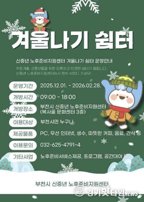 이소영 부천시 돌봄지원과장은 “겨울나기 쉼터는 시민들이 추위를 피해 따뜻하게 머물며 이웃과 자연스럽게 마주하고 소통할 수 있는 공간”이라며 “쉼터 이용이 노후준비 상담과 교육 등 다양한 서비스로 이어질 수 있도록 운영해 나가겠다”고 말했다.