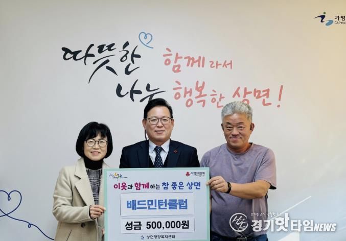 [경기핫타임뉴스=김형철 기자] 가평군 상면 배드민턴클럽 회원 일동은 지역 내 어려운 이웃을 돕기 위해 상면 행정복지센터에 성금 50만 원을 기탁했다.