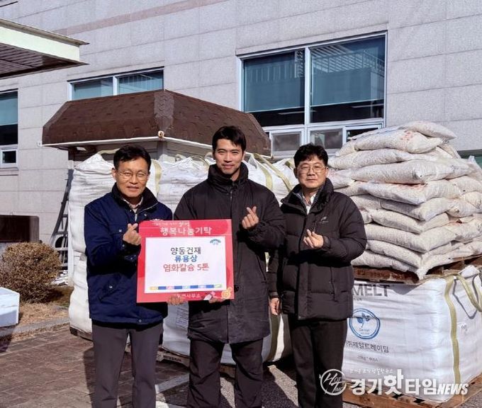 [경기핫타임뉴스=김형철 기자] 양평군 양동면은 지난 19일 양동건재 류용상 씨가 양동면사무소를 방문해 겨울철 제설작업에 사용될 염화칼슘 5톤을 기탁하며 지역사회 안전과 이웃사랑 실천에 동참했다고 밝혔다.