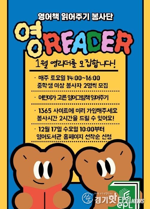 [경기핫타임뉴스=김형철 기자] 의정부영어도서관은 2026년 1월부터 영어책 읽어주기 봉사단 ‘영리더’가 참여하는 재능기부 프로그램 ‘Please Read a Book’을 운영한다.