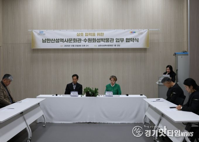 [경기핫타임뉴스=김삼영 기자] 남한산성역사문화관과 수원화성박물관은 2025년 12월 23일, 남한산성역사문화관에서 세계유산 성곽의 연구·보존·활용을 위한 업무협약(MOU)을 체결했다.