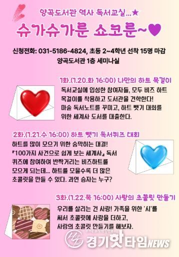 [경기핫타임뉴스=김형철 기자] 김포시는 2026년 1월 20일 오후 4시부터 6시까지 1층 세미나실에서 초등학교 2~4학년을 대상으로 한 역사 독서교실 '슈가슈가룬 쇼코룬'을 운영한다.
