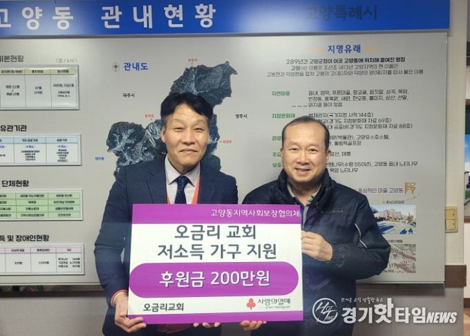 [경기핫타임뉴스=김형철 기자] 고양특례시 덕양구 고양동은 지난 23일 오금리교회에서 경제적 어려움을 겪는 이웃을 돕기 위해 고양동 지역사회보장협의체에 후원금 200만 원을 기탁했다고 밝혔다.