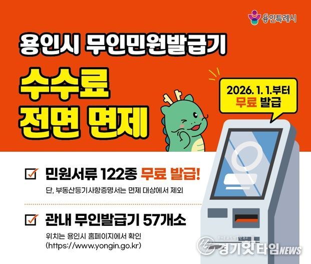 [경기핫타임뉴스=김삼영 기자] 용인특례시는 2026년 1월 1일부터 지역 내 설치된 무인민원발급기에서 발급되는 민원서류 수수료를 전면 면제한다고 25일 밝혔다.