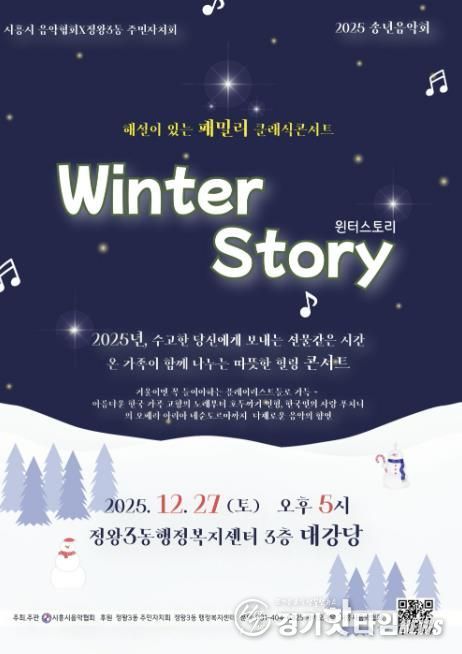 [경기핫타임뉴스=김삼영 기자] 시흥시음악협회는 정왕3동 주민자치회와 협력해 오는 12월 27일 오후 5시, 정왕3동 행정복지센터 3층 대강당에서 2025 송년 음악회 ‘해설이 있는 패밀리 클래식 콘서트, 윈터 스토리’를 개최한다.