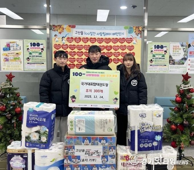 [경기핫타임뉴스=김형철 기자] 의정부시 고산동주민센터는 12월 24일 고산동 소재 국가대표 탑 태권도장이 지역 저소득층을 위해 두루마리 화장지 300개를 기부했다고 밝혔다.